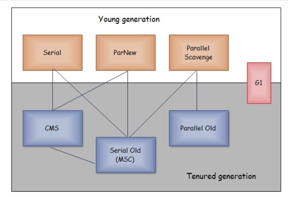 上图中连线标识垃圾收集器可以配合使用