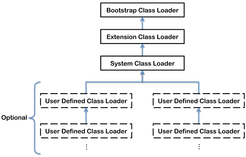 下图展示的类加载器之间的层次关系,称为类加载器的双亲委派模型。该模型要求除了顶层的Bootstrap ClassLoader外,其余的类加载器都应该有自己的父类加载器。这里类加载器之间的父子关系一般通过组合关系实现,而不是通过继承的关系实现。
