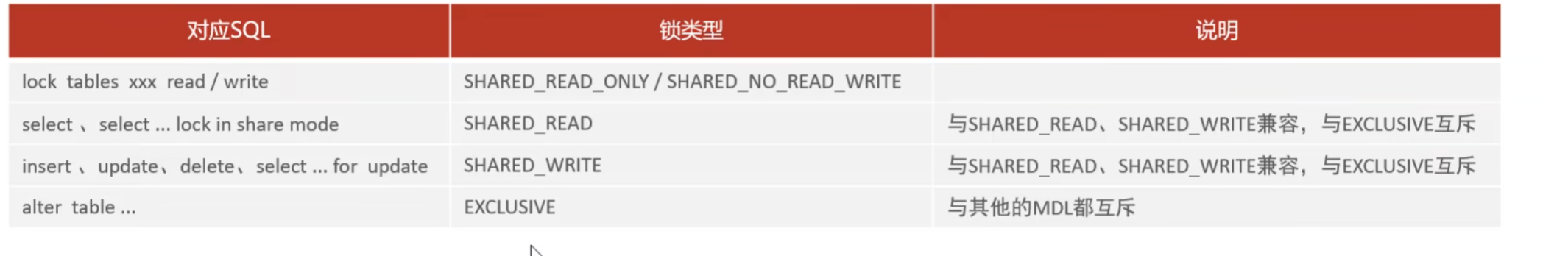 在对一张表进行增删改查的时候,加MDL读锁(共享);当对表结构进行变更操作的时候,加MDL(排他锁)