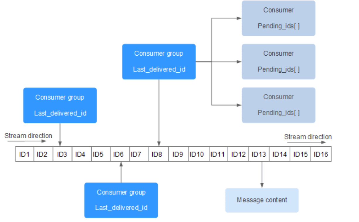 Consumer Group:消费组,一个消费组有多个消费者(Consumer),这些消费者之间是竞争关系。last_delivered_id:游标,每个消费组会有个游标last_delivered_id,任意一个消费者pending_ids:消费者(Consumer)的状态变量,作用是维护消费者的未确定的id。pending_ids记录了当前已经被客户端读取的消息,但是还没有被ack。如果客户端没有ack,这个变量里面的消息ID会越来越多,一旦某个消息被ack,它就开始减少。这个pending_ids变量在Redis官方被称为PEL,也就是Pending Entries list。它用来确保客户端至少消费了消息一次,而不会在网络传输的中途丢失了没有处理。